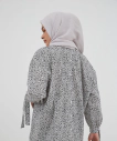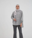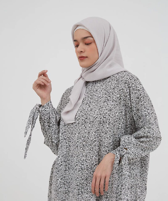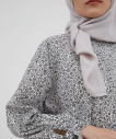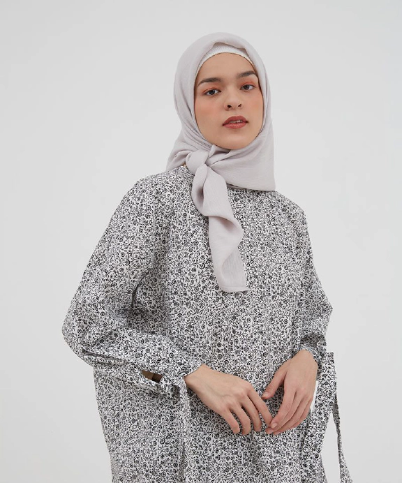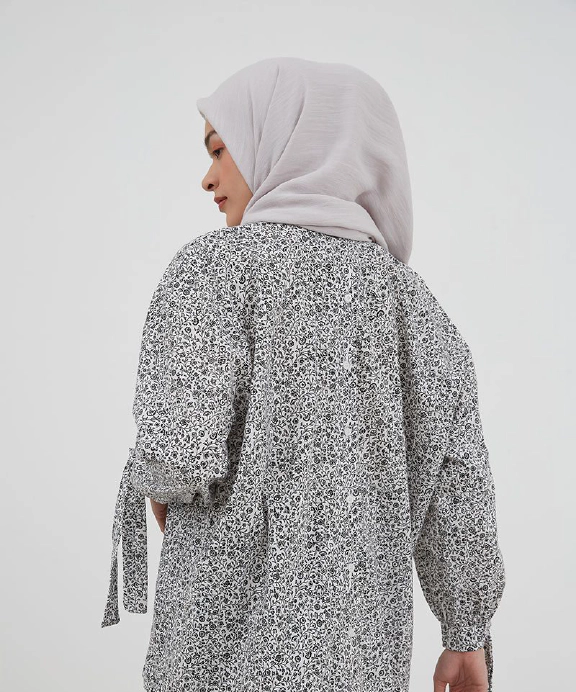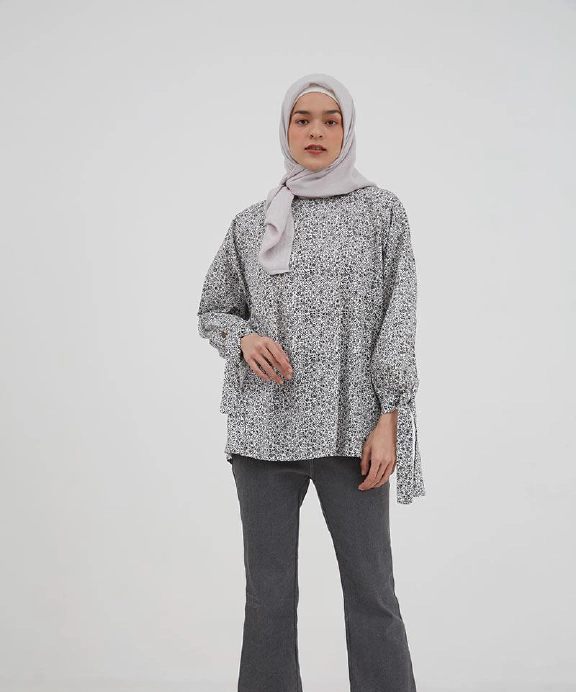 Tampil feminin dengan blouse yang memiliki motif menarik. Padankan dengan celana slim fit serta hijab dan mules warna
